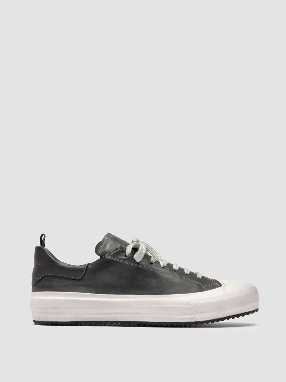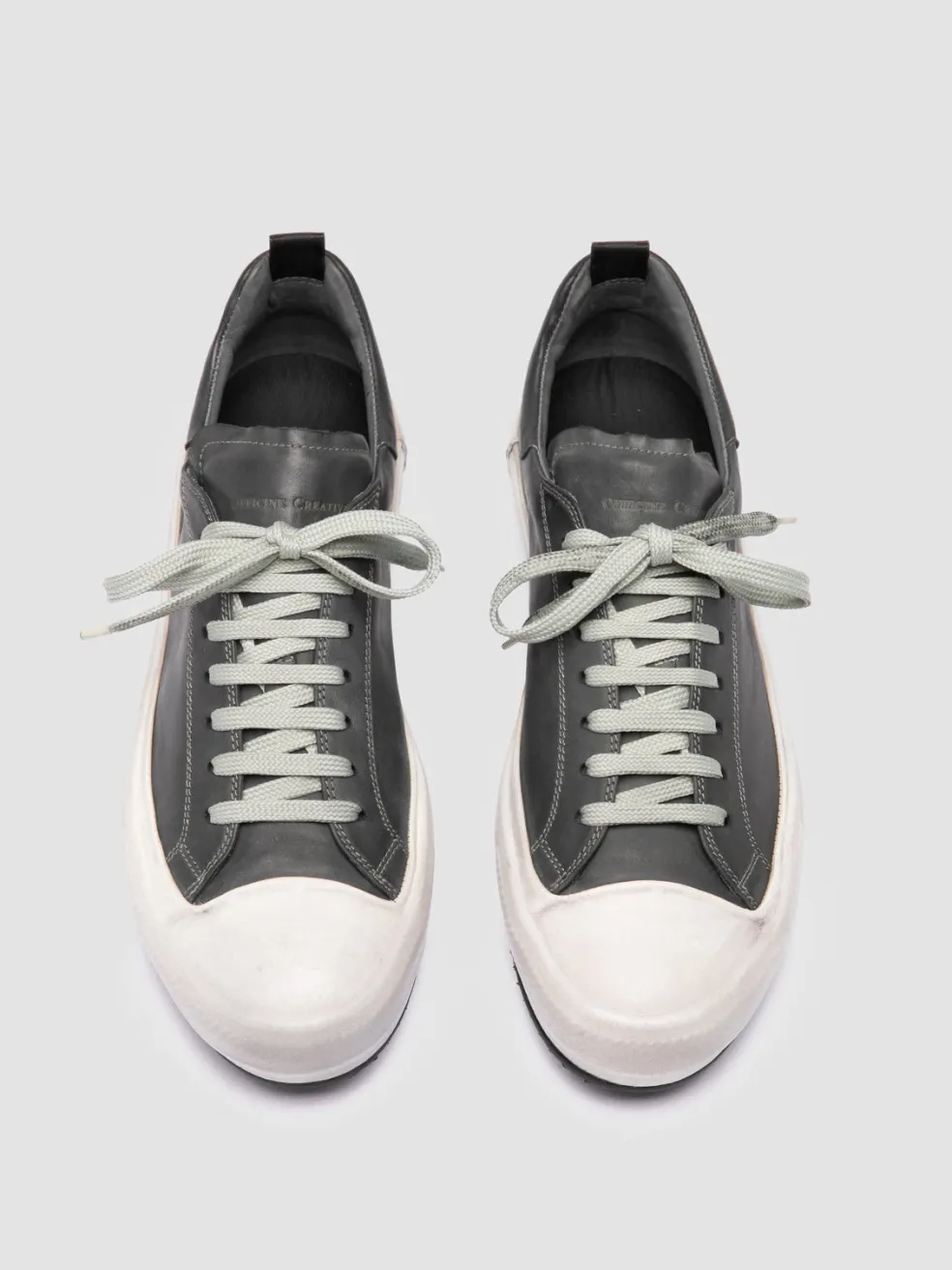 The Mes DD 001 sneakers blend retro charm with luxe craftsmanship. Handmade in Italy from grey leather, they sport a distinct stitched upper with deep-dyed finish, set on encased rubber sole for effortless aesthetic and comfort.
