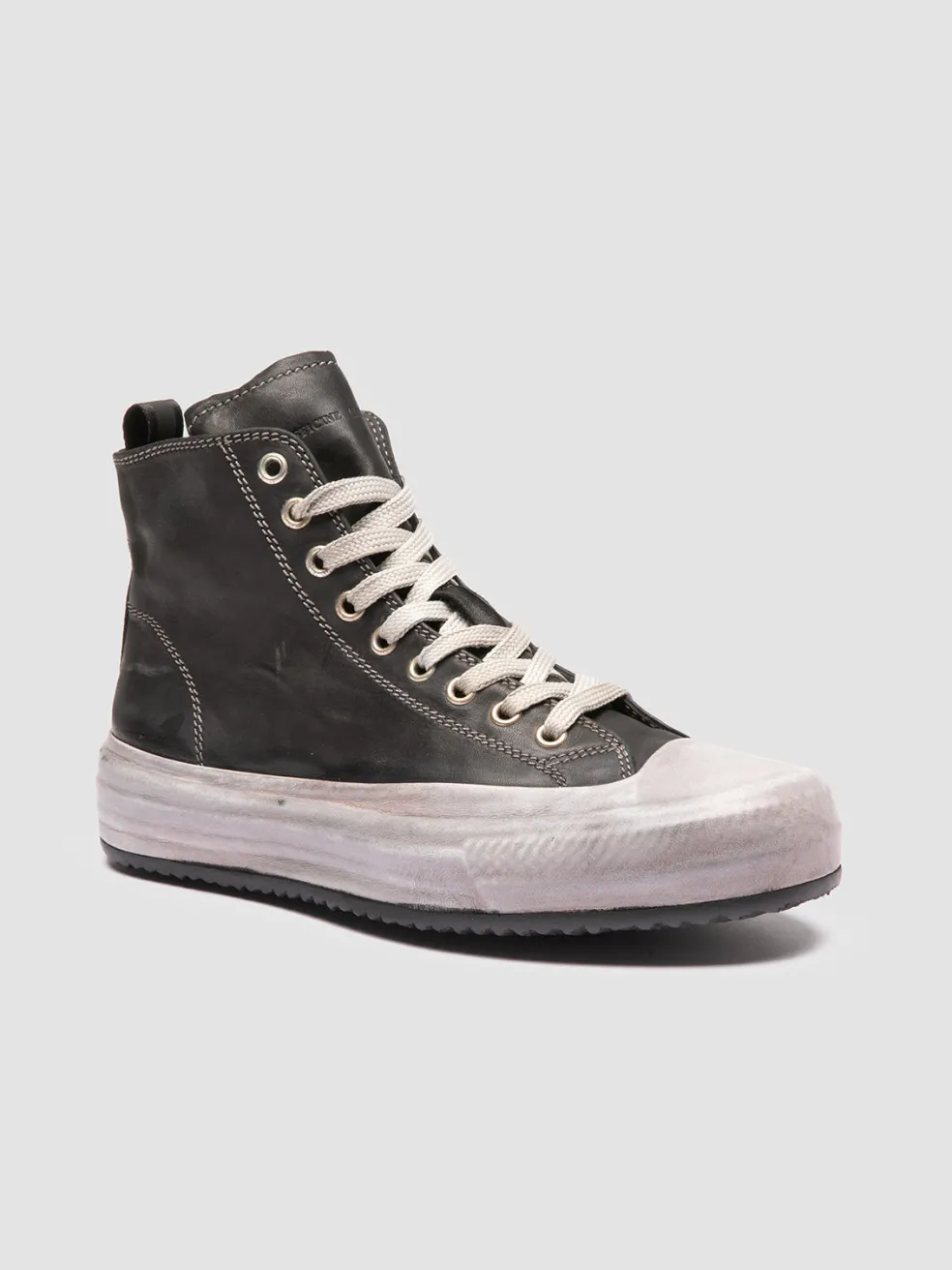 The Mes DD 102 marries high-end craftsmanship with a streetwise aesthetic. These high-top sneakers are handcrafted in Italy from black leather, with a carefully stitched and deep-dyed upper and an encased, durable rubber sole.
