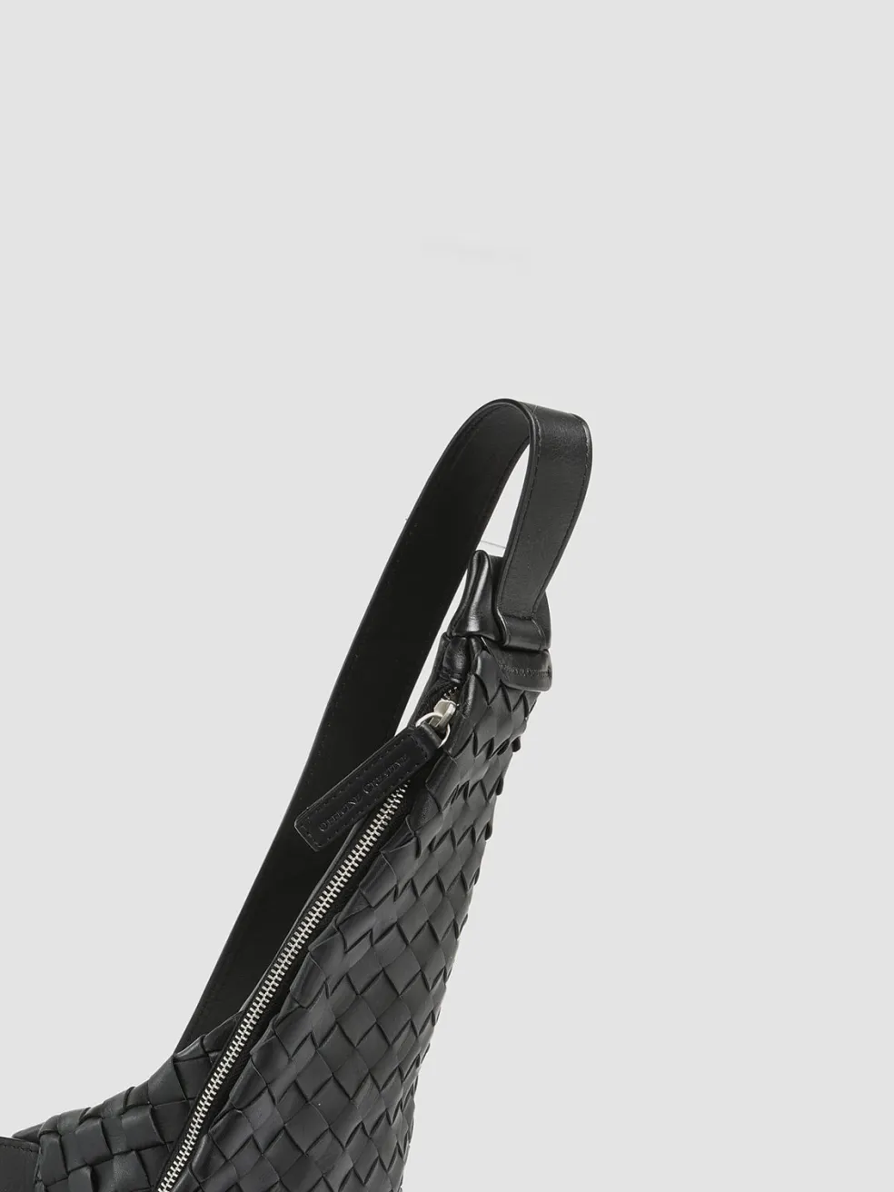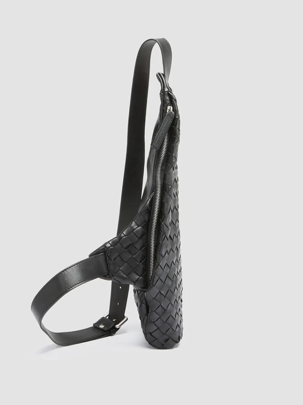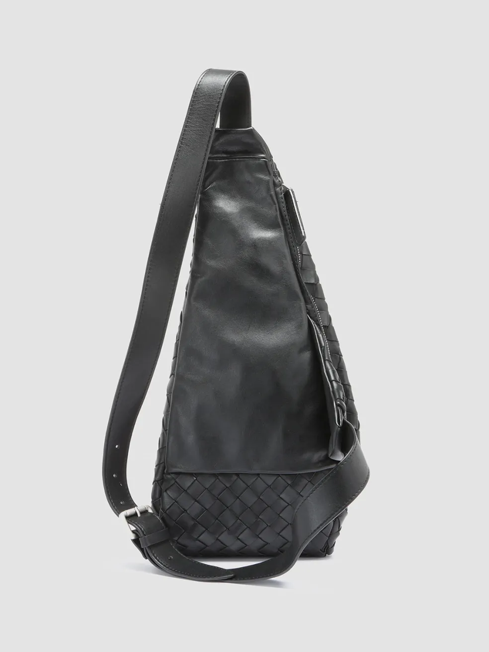 Our exclusive Armor one-shoulder backpack is the perfect accessory for a contemporary and sophisticated smart-casual style. It is handcrafted from fine black woven and smooth leather and features a triangular design main compartment closed by zip at the side adjustable shoulder strap silver-tone metal hardware and logo lettering embossed at the zip puller.