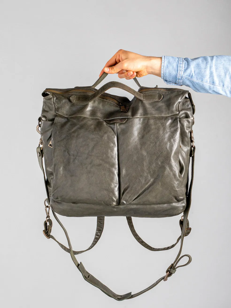 Handcrafted from premium black leather our large rectangular backpack stands out with its practical versatile and truly flawless design. Also perfect as a handbag and crossbody bag it features a top handle adjustable back straps an adjustable and detachable shoulder strap two-way zipped main compartment front pockets with side zips suede lining two internal pockets and antiqued gold-tone metal hardware.