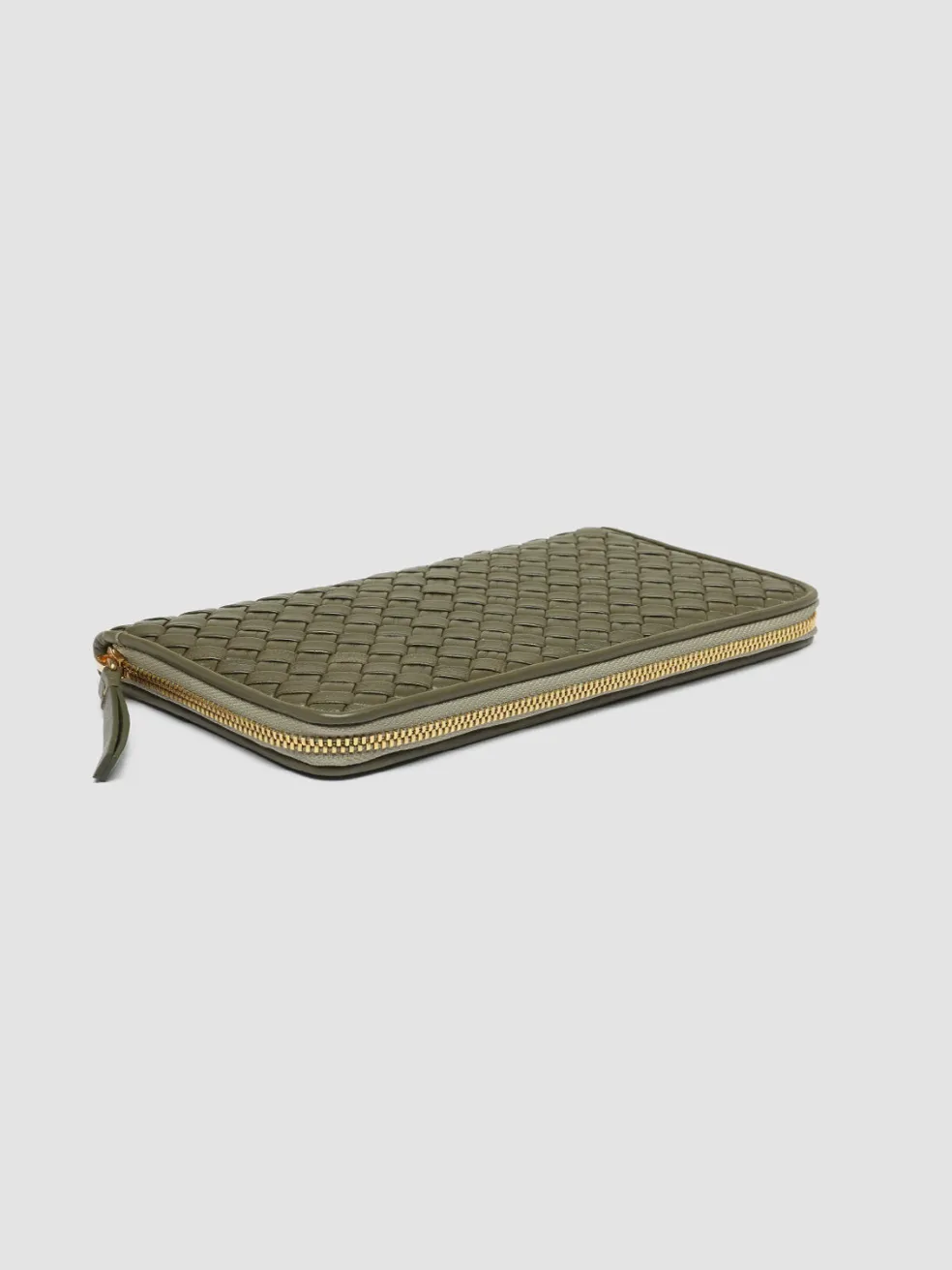 Great for organizing all your documents, our Juliet large wallet is handcrafted from premium green woven leather. It features a gold-tone metal zip around fastening, a zipped pocket, an open compartment and multiple card slots.
