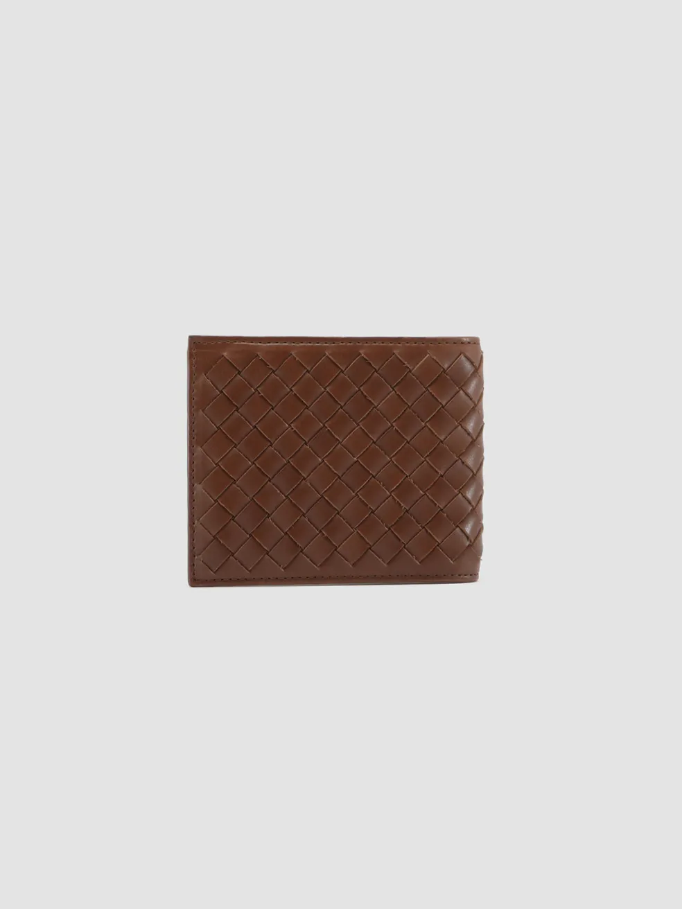 Our refined handcrafted Boudin brown leather bifold wallet is distinguished by a finely woven motif on the outside, while inside it reveals eight card slots, bill compartments and embossed gold-tone lettering logo.