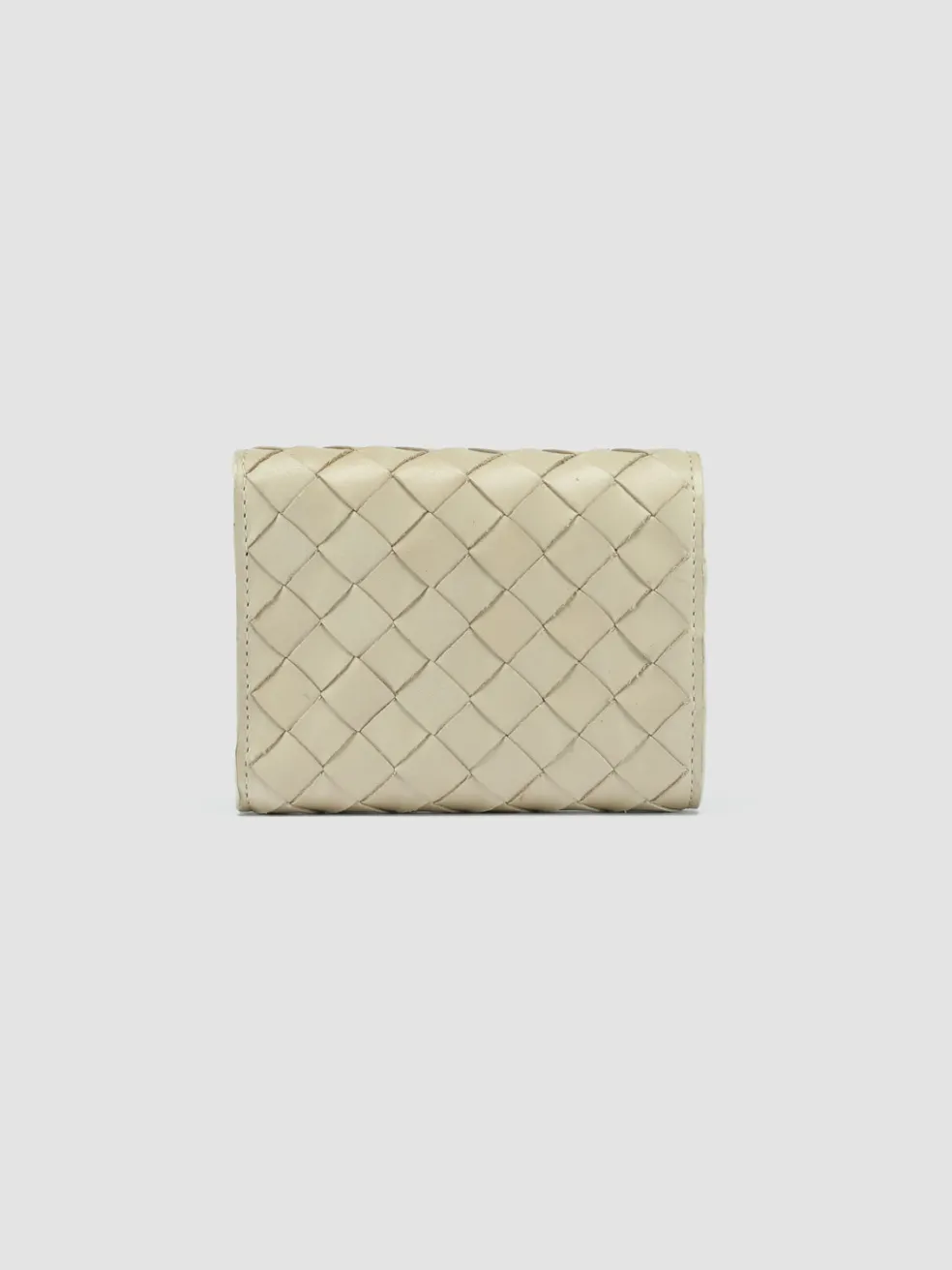 Compact and practical, our Poche trifold wallet is handcrafted from finely woven cream-tone leather. It reveals a snap button closure, multiple bill compartments and card slots, side zip pocket and gold-tone metal hardware.