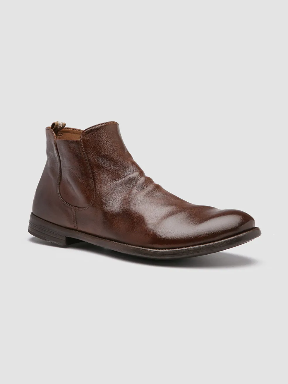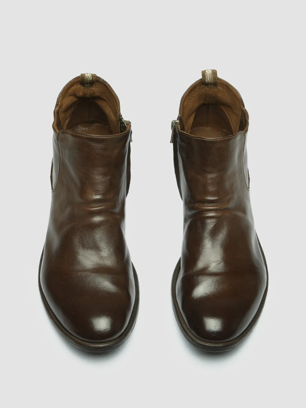 Our comfortable Chelsea boots reveal a versatile and smart-casual style. Crafted by our best craftsmen from premium smooth leather in a warm shade of light brown they feature a strategic side zip fastening rounded almond toe our signature grosgrain heel pull tab and a caoutchouc sole with a stacked heel.