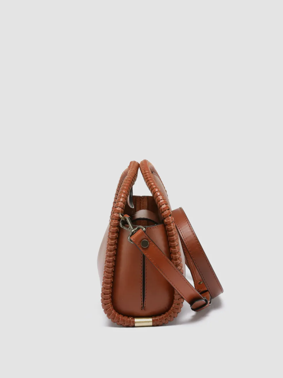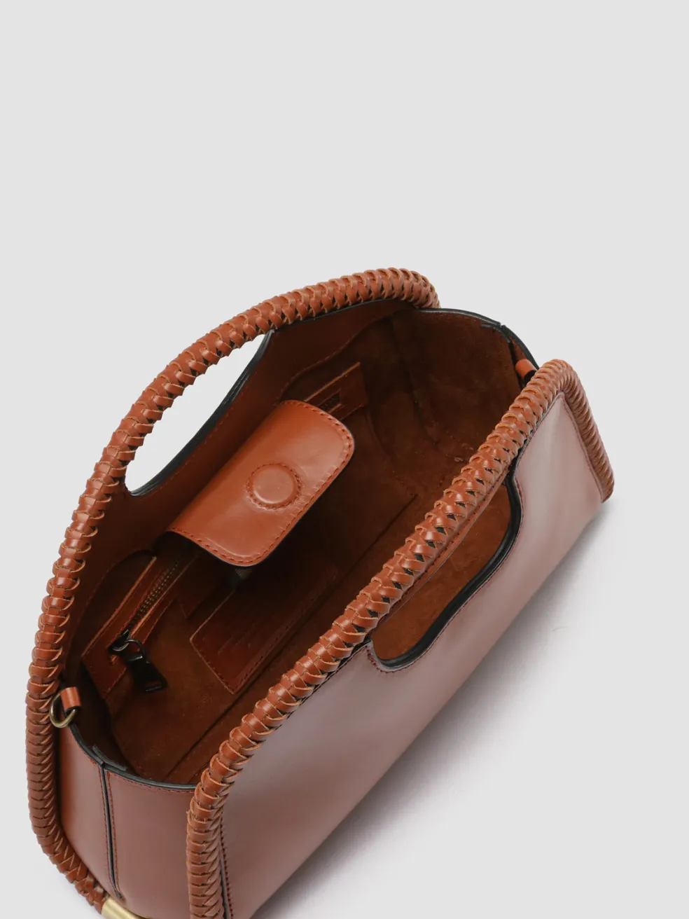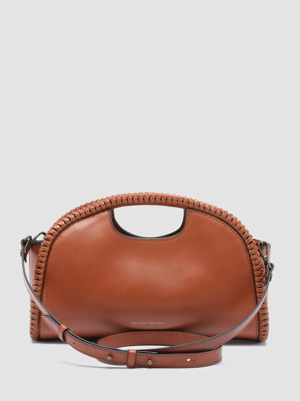 A rounded silhouette highlighted by woven leather profiles with golden details on the sides distinguishes our CABALA clutch bag in precious light brown leather. Featuring an adjustable and detachable shoulder strap, it reveals our lettering logo printed on the back, internal panel with magnetic fastening, suede lining, internal zip pocket and antiqued gold-tone metal hardware.