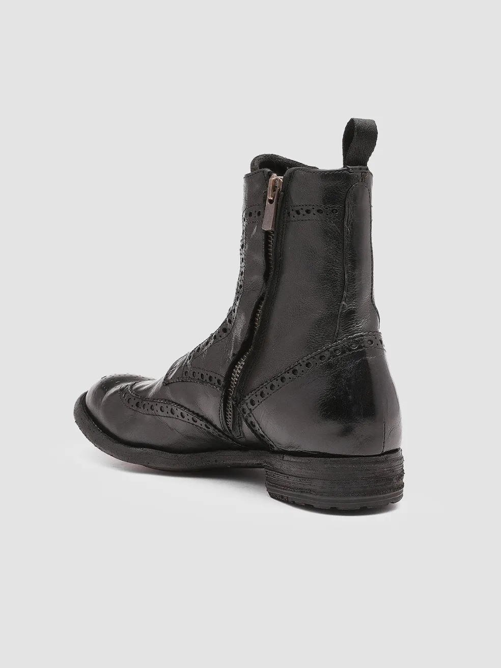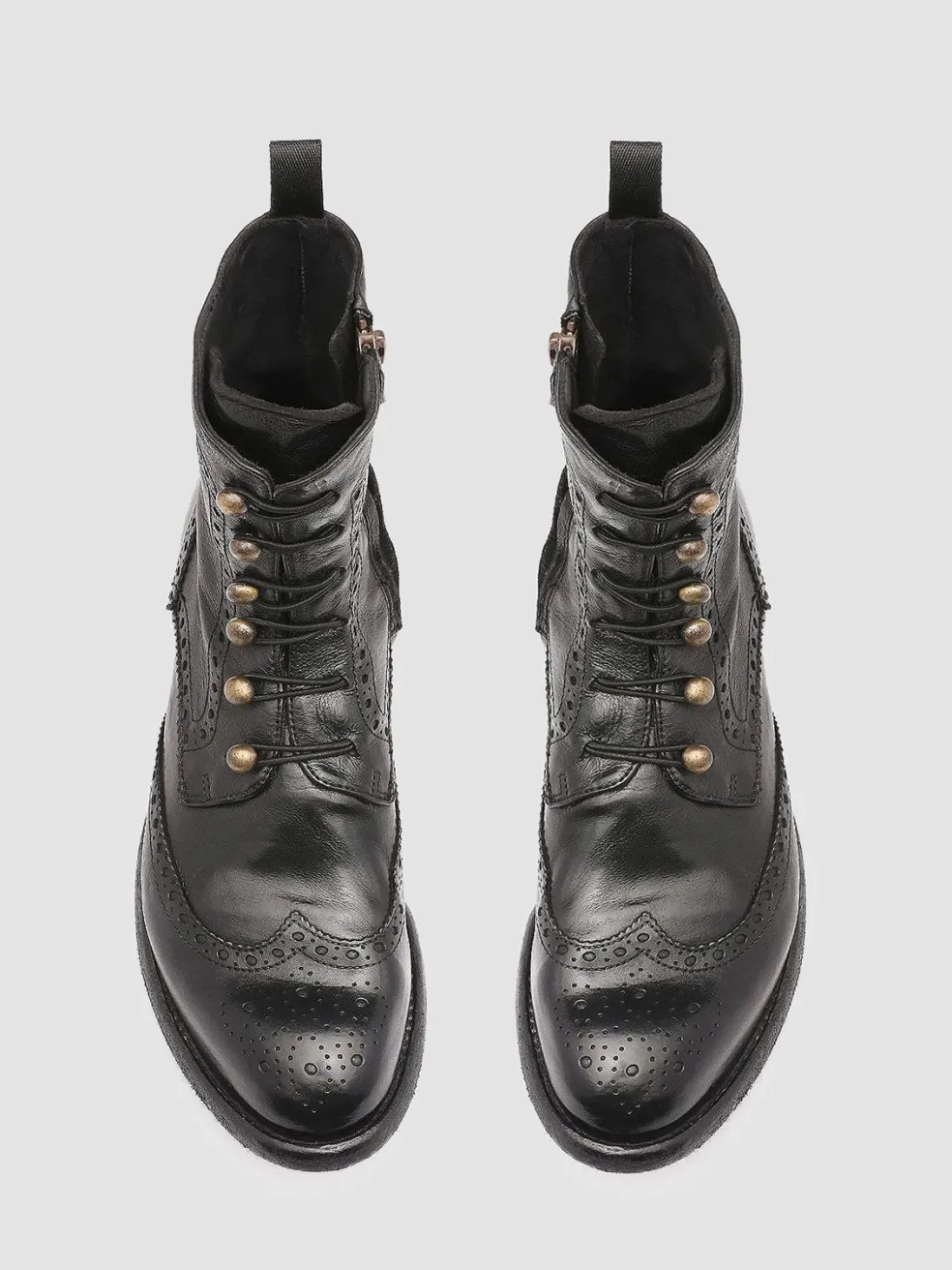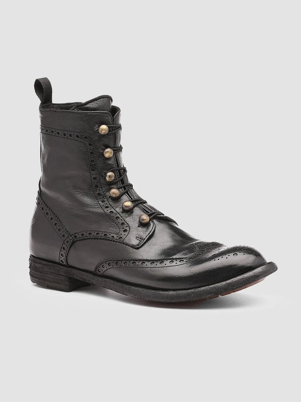 Refined details of classic elegance embellish our comfortable Lexikon artisan ankle boots. They are crafted from very high quality black soft leather and have an almond-shaped silhouette brogue motif an exclusive front closure with gold-tone pearl buttons and elasticated eyelets side zip fastening grosgrain heel pull tab and a leather sole with low stacked heel and tread rubber inserts.