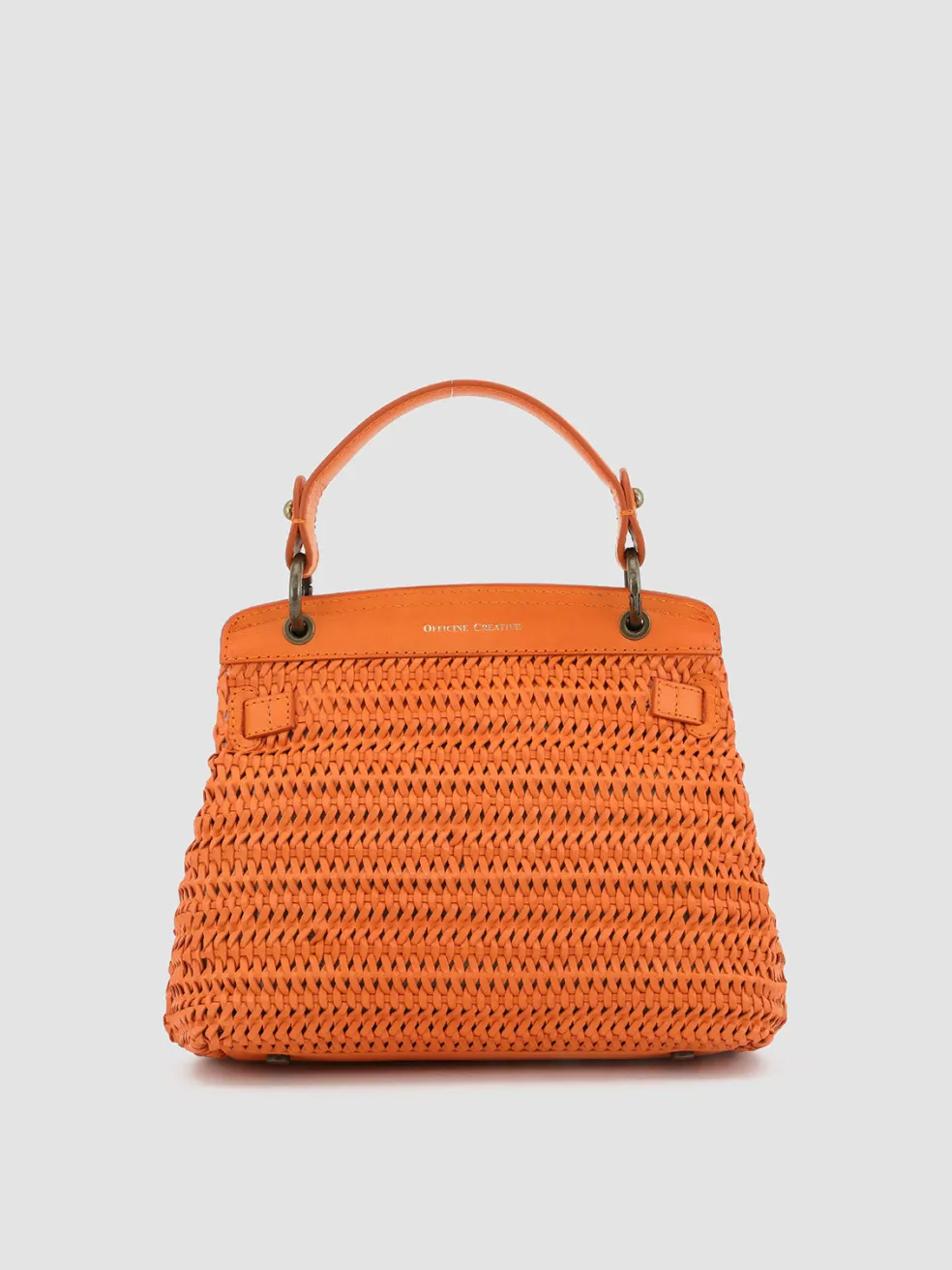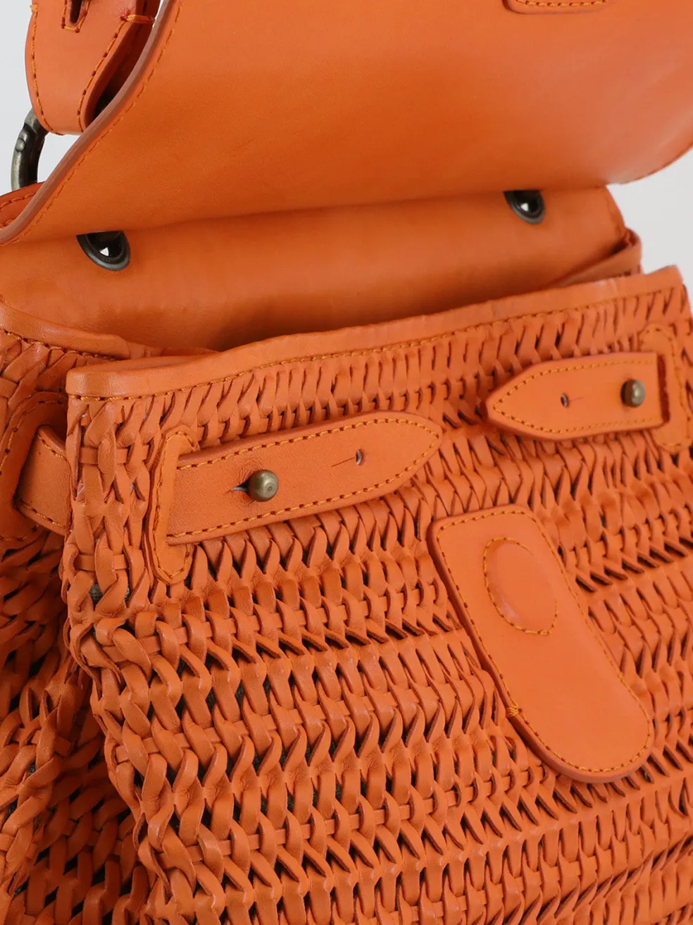 The Nolita 09 handle bag is made from premium orange leather. This model stands out for the intricately handwoven leather silhouette, featuring an accordion structure, antique-finish metal elements, a top handle and a removable strap.