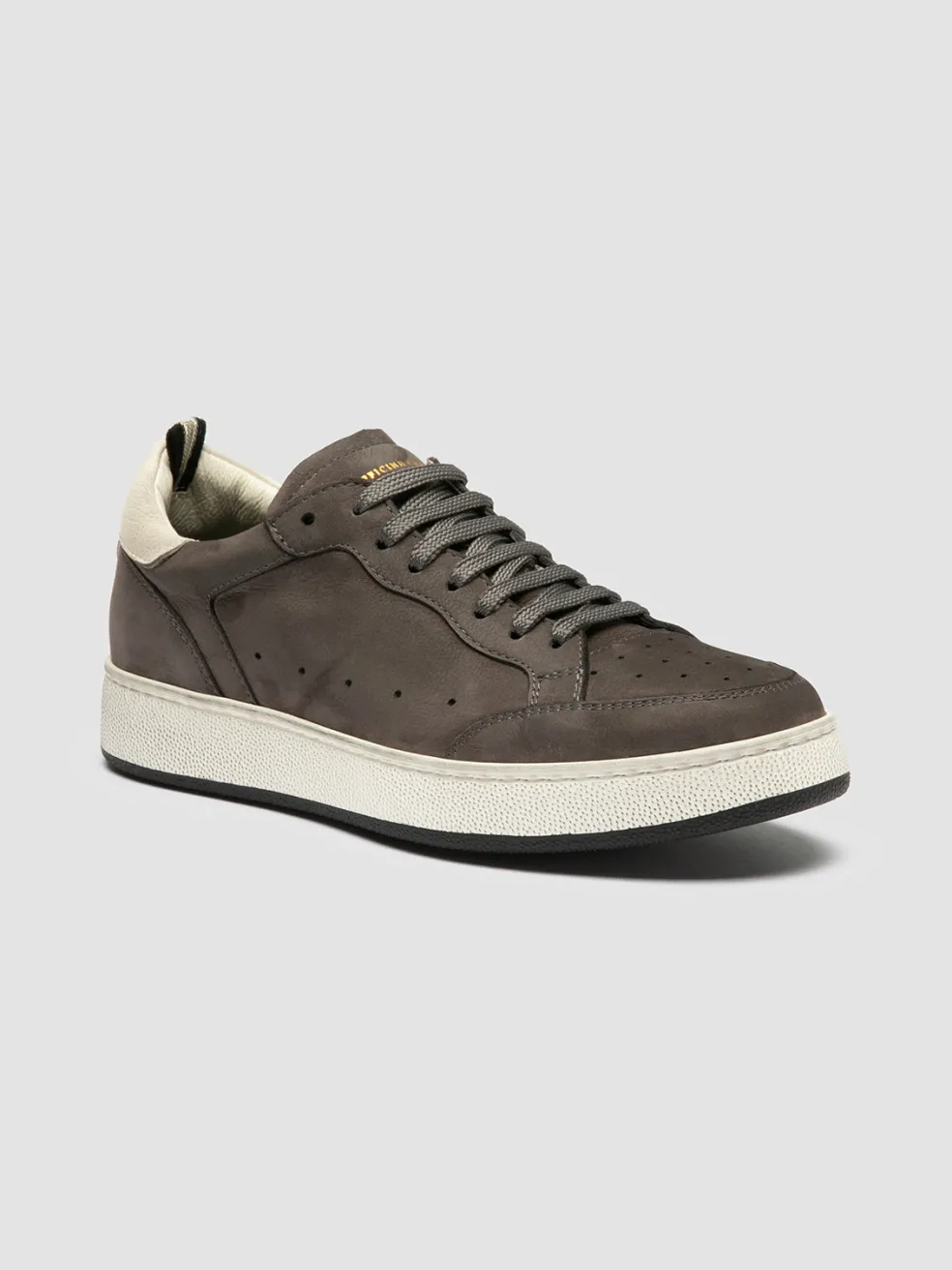 A nod to the taste of the OC clientele, the Answer 102 low top sneakers are handcrafted in Italy from nubuck leather. Extremely light, they feature an unlined grey silhouette with a white heel patch and a rubber sole.