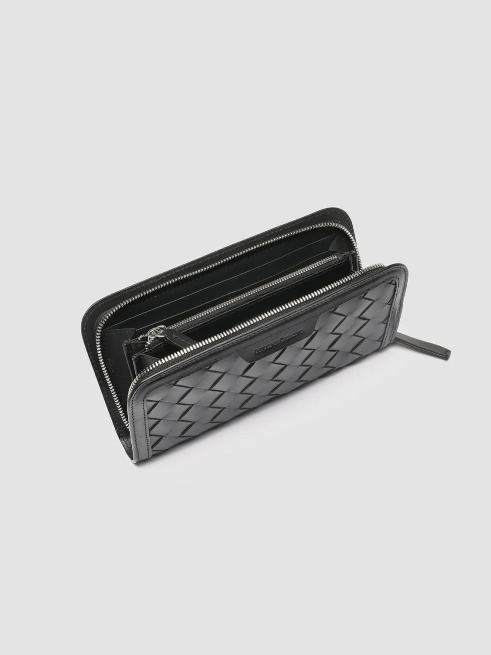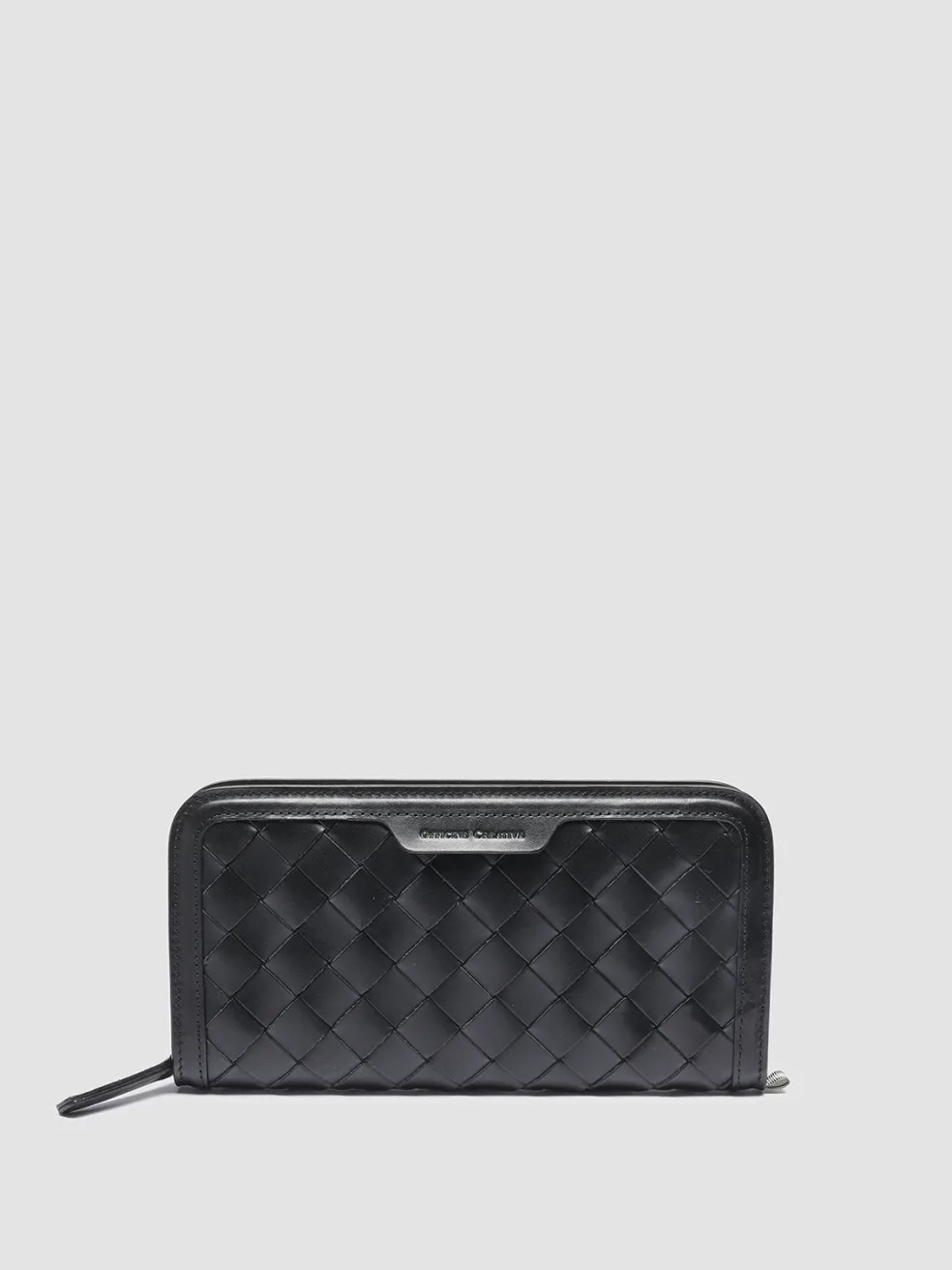 Elegance and practicality come together to perfection in our Bergé wallet in fine black woven leather. It is expertly handcrafted by our artisans and reveals smooth tone-on-tone leather edges leather tab with embossed lettering logo at front zip around fastening two internal compartments with central zipped pocket card slots silver-tone metal hardware and iconic grosgrain side loop tab.