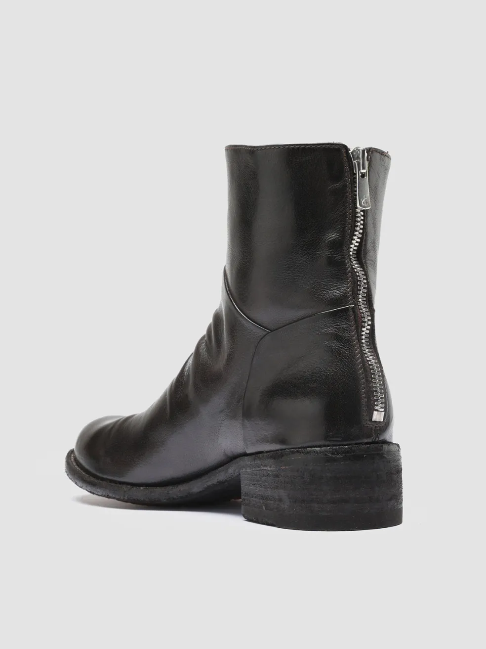 Our Lison ankle boots are great for a contemporary effortless style. Crafted with care by hand from fine dark brown brushed leather they feature a comfortable silhouette with rounded toe soft front pleats back zip fastening and leather sole with a low stacked heel and commando rubber pads.
