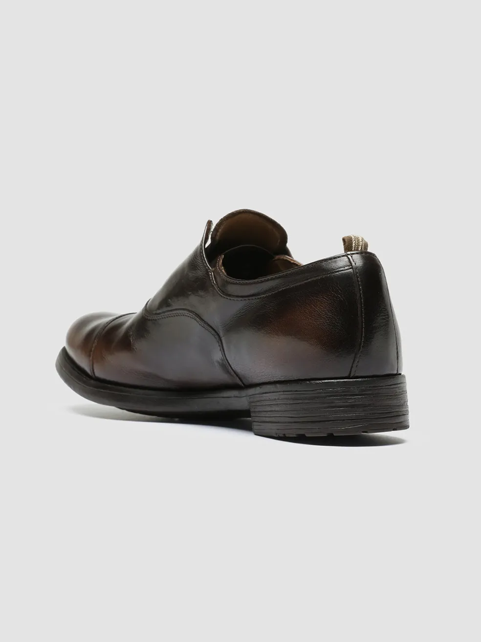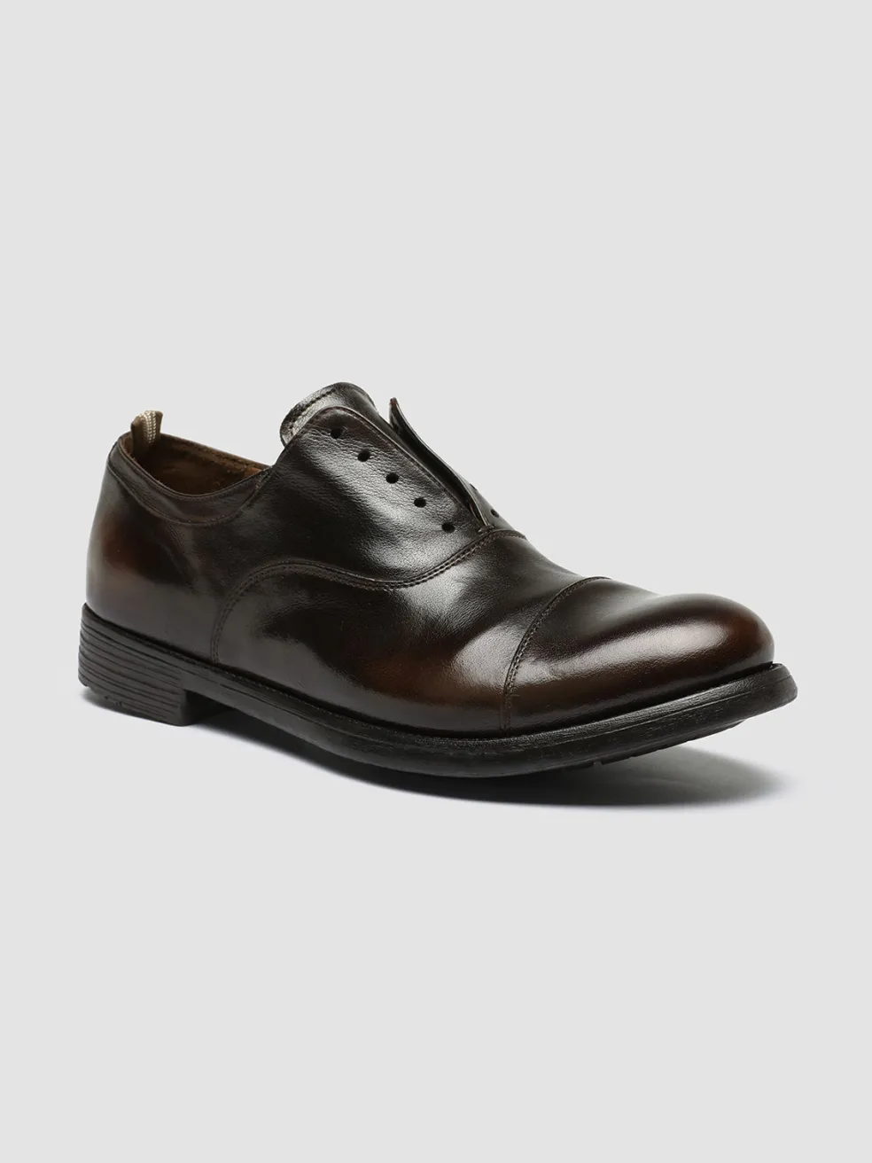 The Hive 004 brown leather Oxford shoes blend classic Italian craftsmanship with contemporary refinement, offering a sleek laceless silhouette that rests on a durable rubber sole and a low-stacked heel.