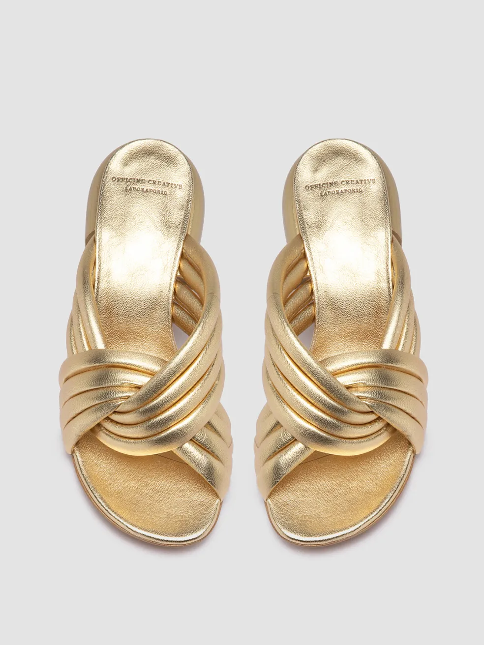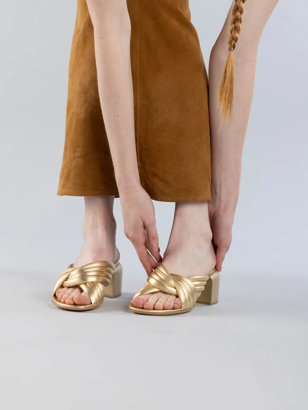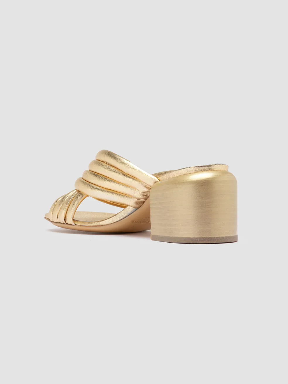 Radiate sophistication with the Ethel 022 gold sandals. Made in Italy with premium leather, the unique handwoven straps form an intricate embrace for the feet, harmonising with a sculpted block heel, for a glamorous yet comfortable look. Perfect for enhancing any outfit with a golden touch.