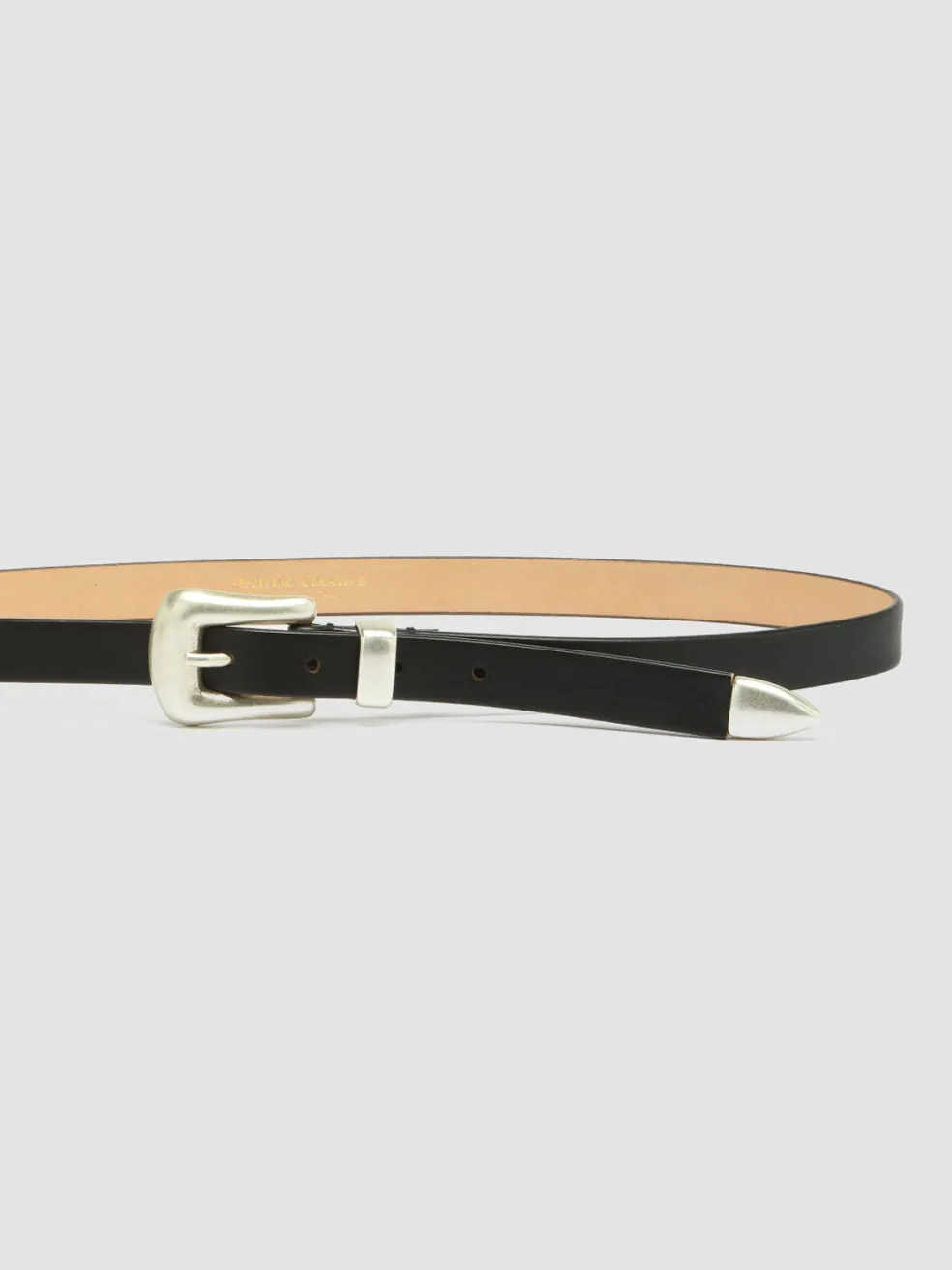 Our OC Strip slim belt in premium black leather stands out with its silver-tone metal bold buckle and pointed tab. Made with care by hand by our artisans, it features lettering logo imprinted on the inside, and is a great accessory to complete your looks with a stylish twist.