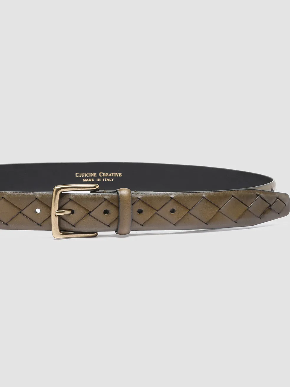 Distinguished by a refined design in woven leather our OC Strip belt is expertly handcrafted from fine airbrushed leather in shades of green. It has a classic square buckle in gold-tone metal logo lettering printed on the inside and our signature grosgrain loop tab.