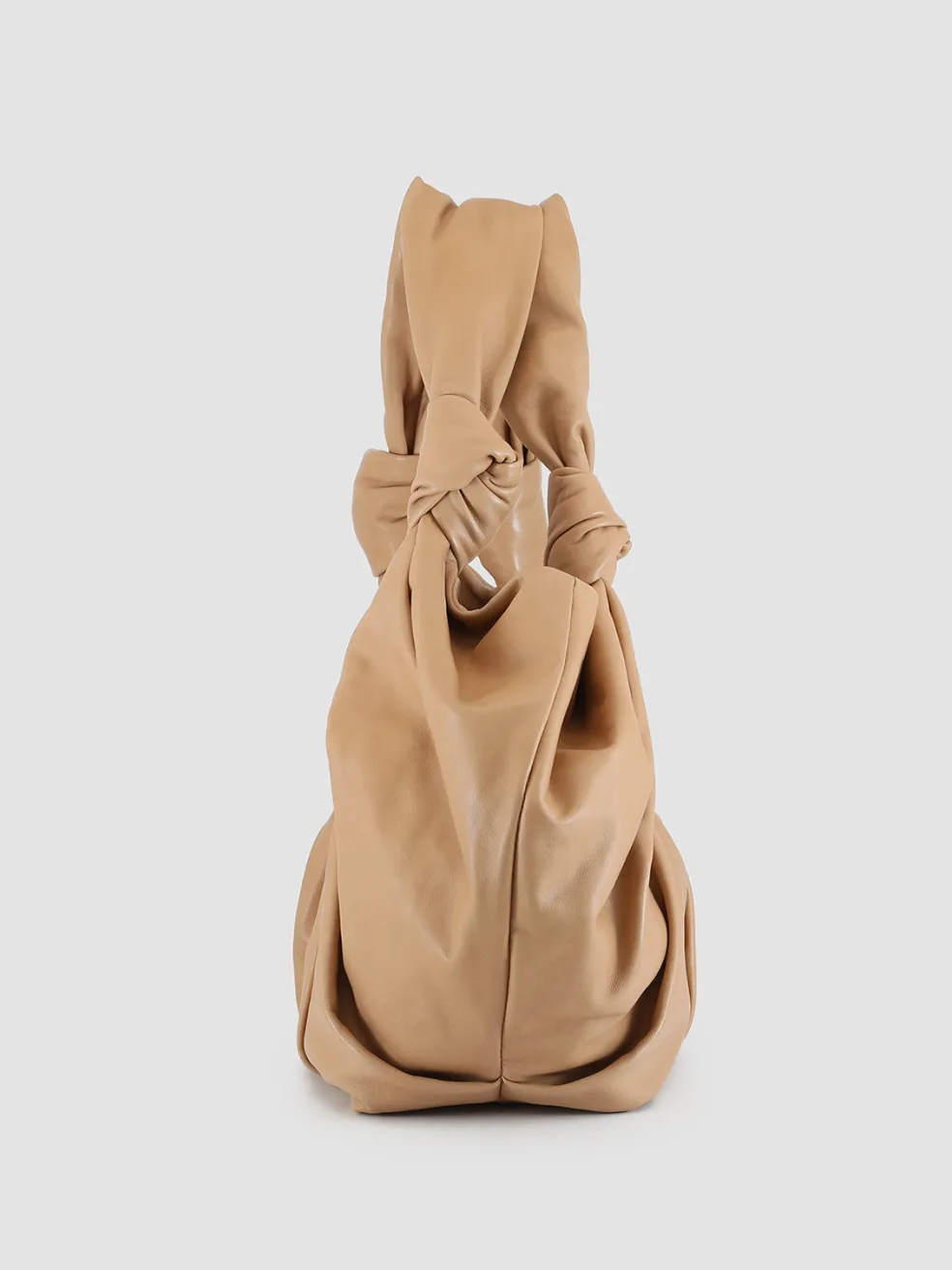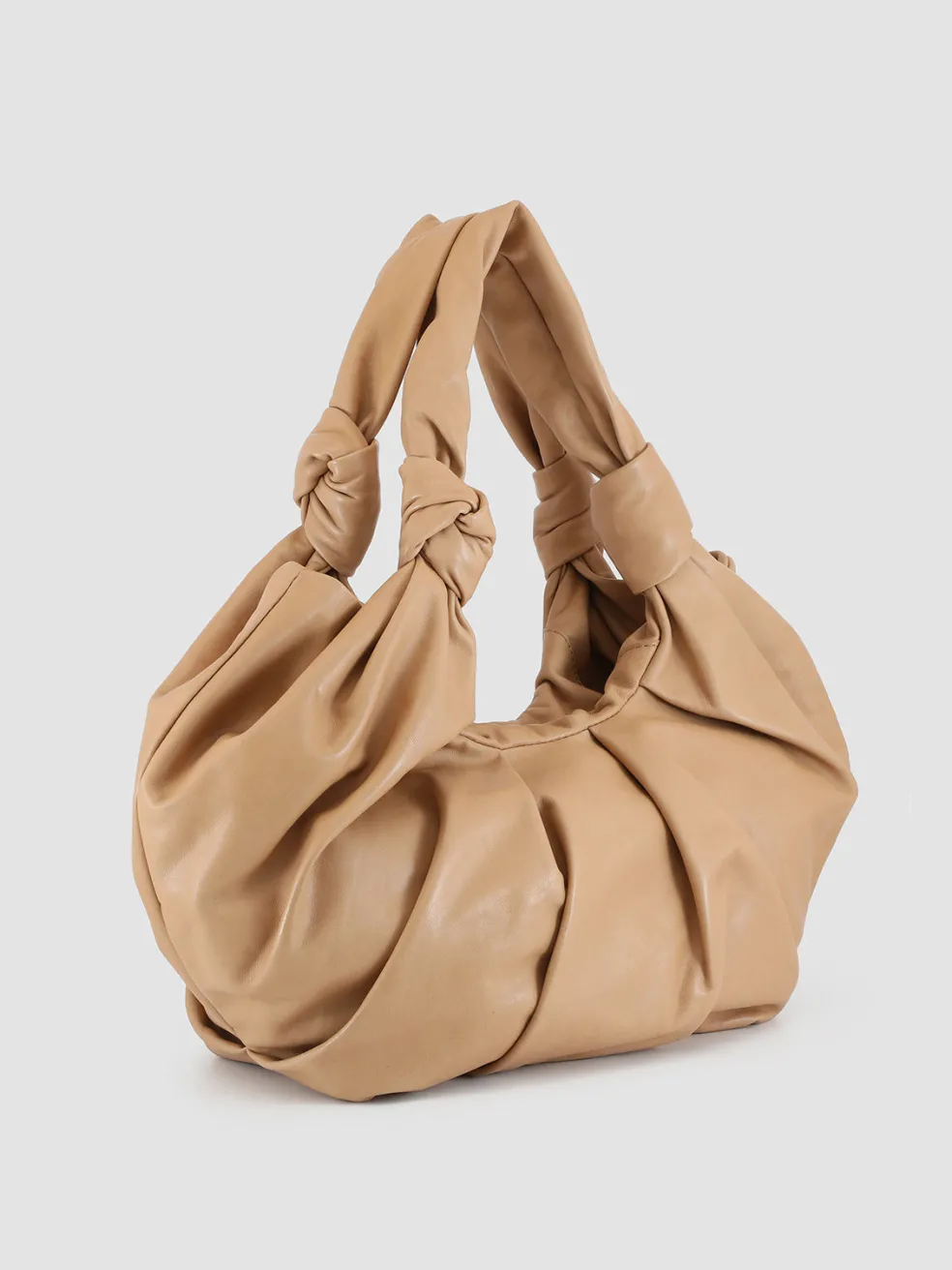 A sophisticated and timeless style marks our super soft BOLINA bag in fine smooth tan leather. Handcrafted by our skilled artisans it features a rounded silhouette enriched by pleats at the sides decorative BOLINA at the two upper handles and a concealed magnetic fastening.