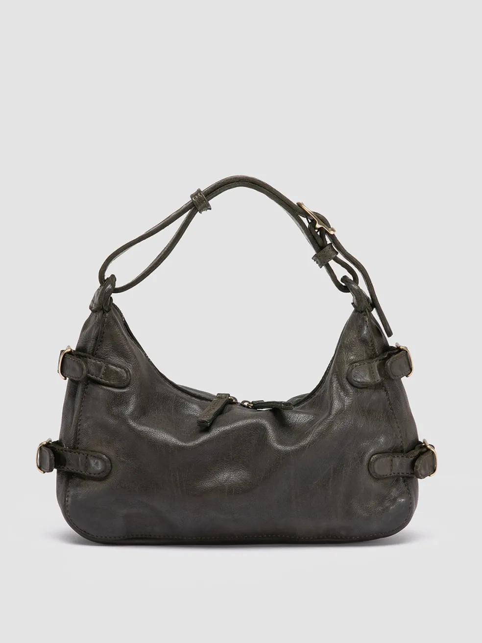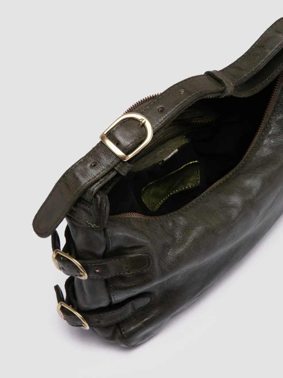 The Julie 009 shoulder bag is a blend of craftsmanship and retro design. Handmade in Italy from lush green leather, this piece is accented with graceful metal buckles, secure zip closure and an internal pocket for your essentials.