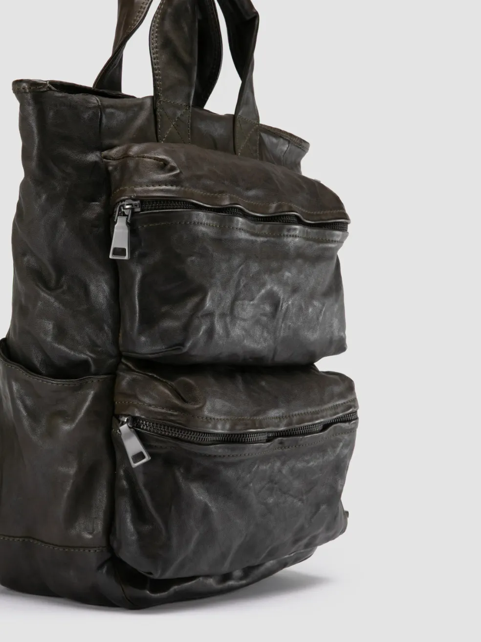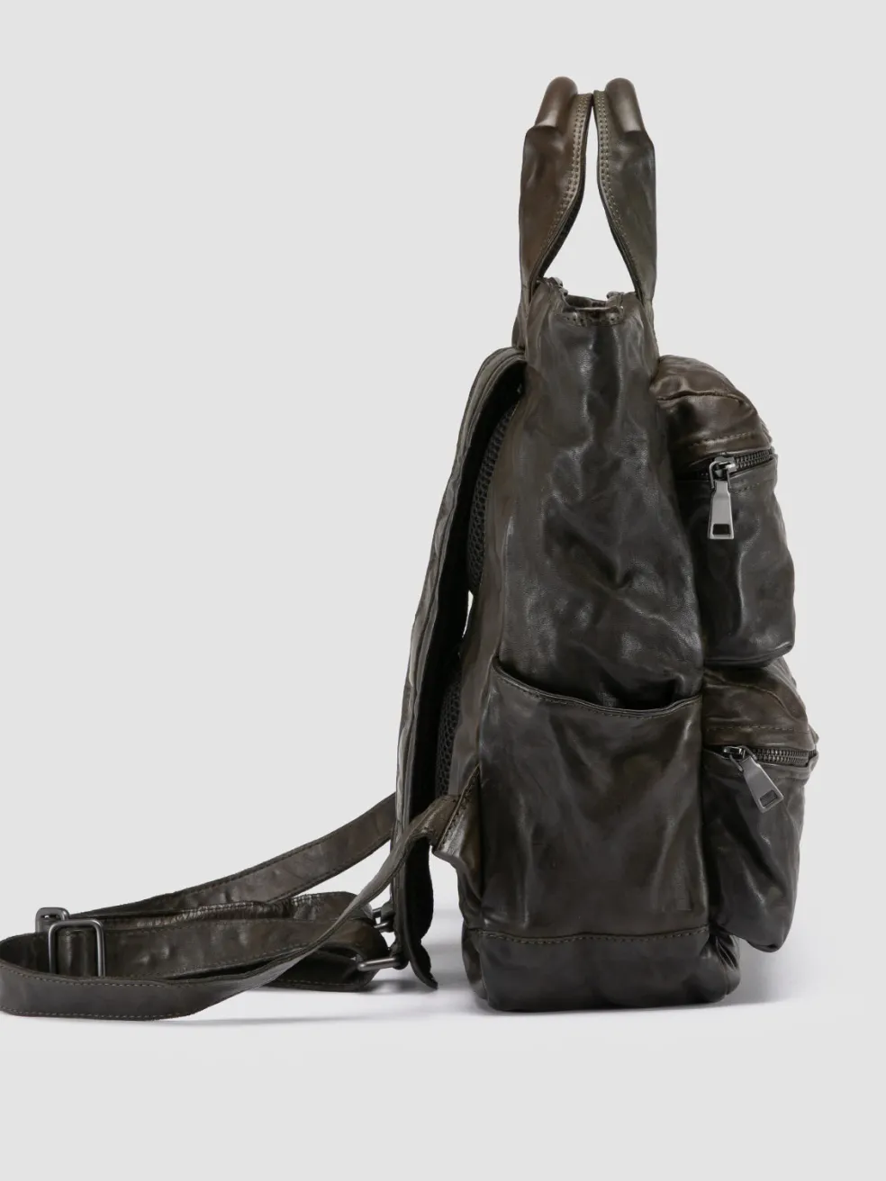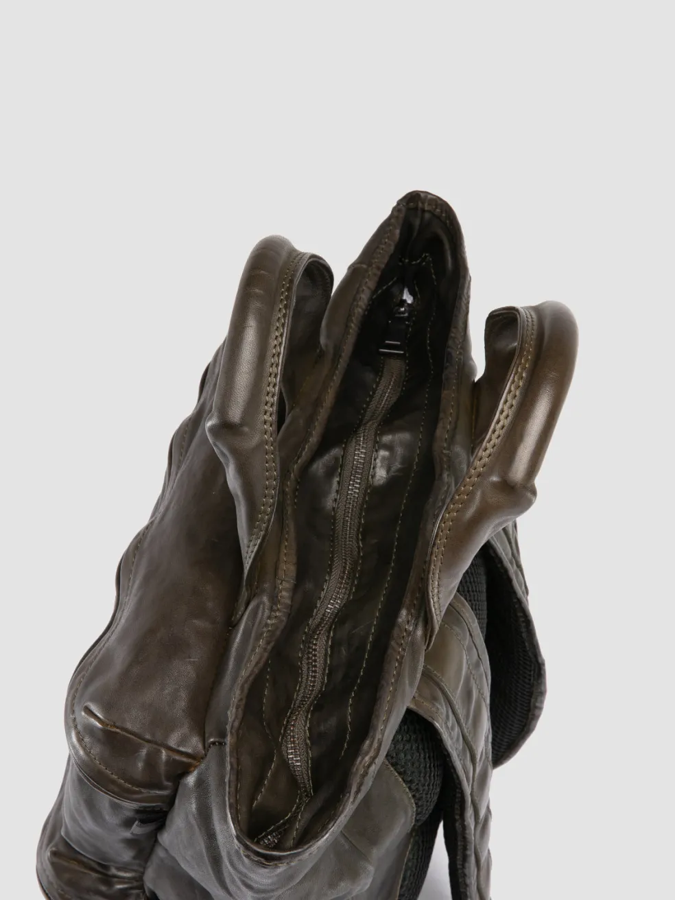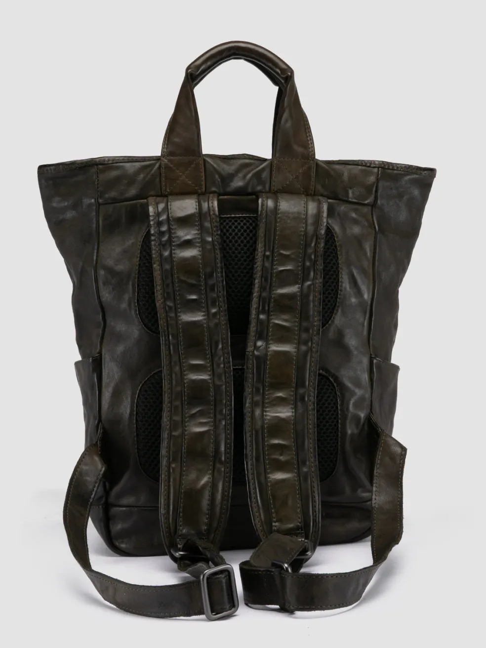 Echoing the practical spirit of military gear, the Recruit 014 backpack is the quintessential ally for the contemporary explorer. Handcrafted in Italy from premium green leather, it’s designed with an ergonomic structure and a padded mesh back panel for increased comfort and improved airflow.